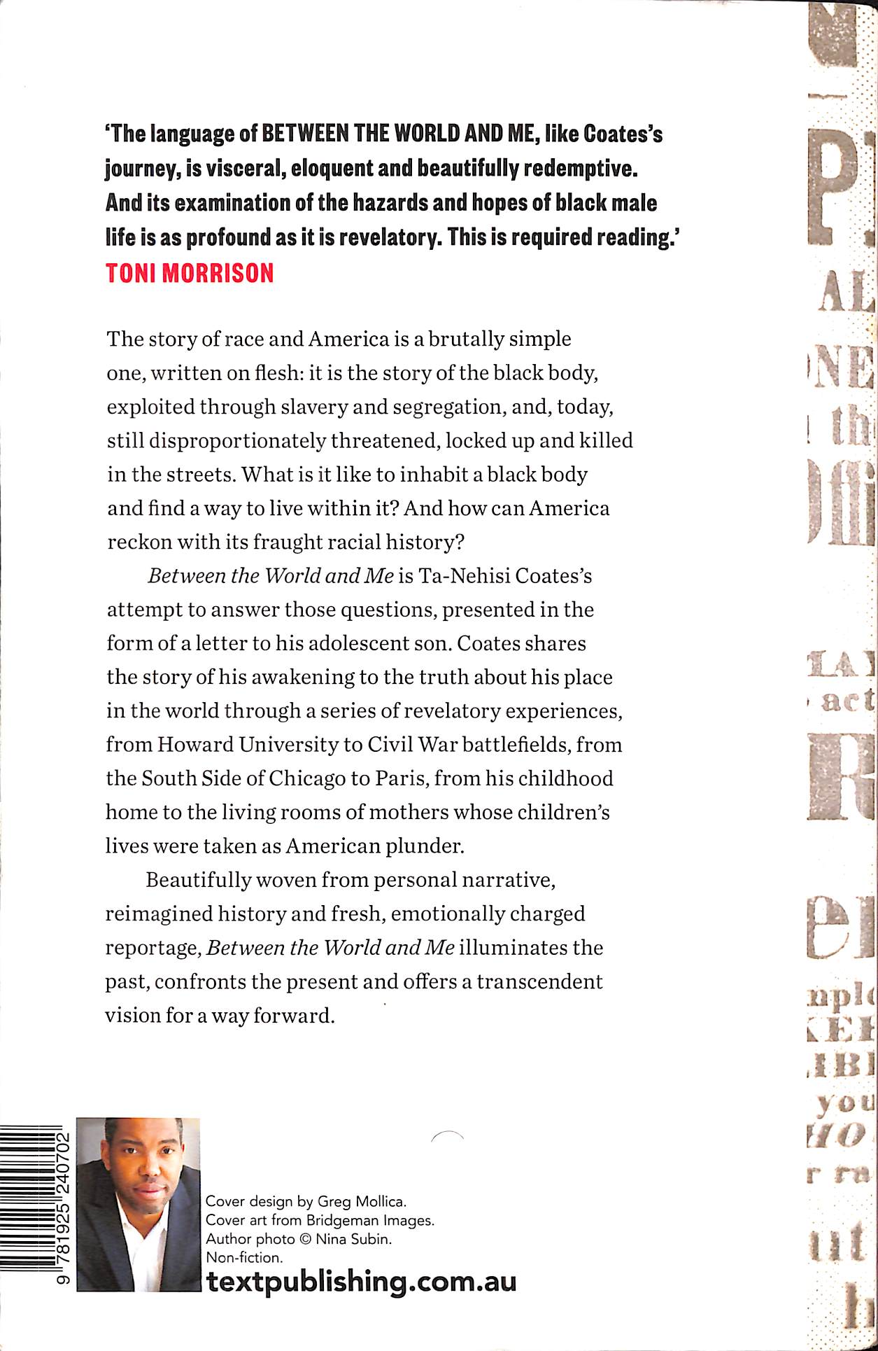 Between the World and Me is Ta-Nehisi Coates’s attempt to answer these questions in a letter to his adolescent son. Coates shares with his son—and readers—the story of his awakening to the truth about his place in the world through a series of revelatory experiences, from Howard University to Civil War battlefields, from the South Side of Chicago to Paris, from his childhood home to the living rooms of mothers whose children’s lives were taken as American plunder. Beautifully woven from personal narrative, reimagined history, and fresh, emotionally charged reportage, Between the World and Me clearly illuminates the past, bracingly confronts our present, and offers a transcendent vision for a way forward.