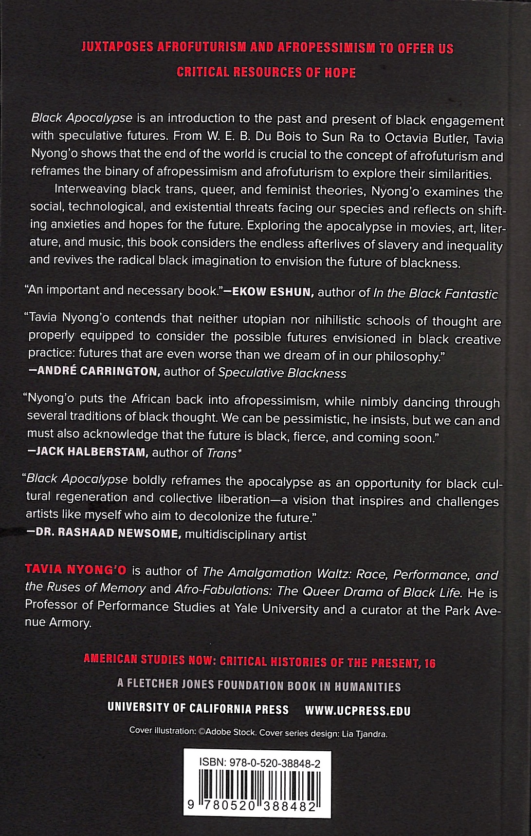 Science fiction imagines aliens and global crises as world-unifying events, both a threat and promise for the future. Black Apocalypse is an introduction to the past and present of black engagement with speculative futures. From Octavia Butler to W.E.B. Du Bois to Sun Ra, Tavia Nyong’o shows that the end of the world is crucial to afrofuturism and reframes the binary of afropessimism and afrofuturism to explore their similarities.