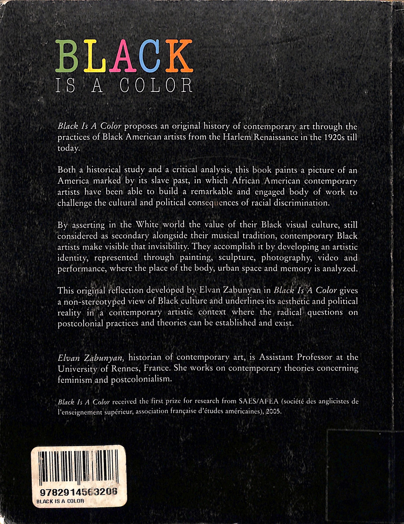 Contemporary art through the lens of African-American artists: Adrian Piper, David Hammons, Renée Green, Faith Ringgold, Senga Nengudi, Pat Ward Williams, Lorraine O’Grady, Carrie Mae Weems, Lorna Simpson, Fred Wilson, Dany Tisdale, June Clark and Gary Simmons. In Black is a Color, contemporary art historian and curator Elvan Zabunyan proposes a new approach to contemporary art and its history through the practice of Black American artists from the Harlem Renaissance to today. Combining a historical study with probing critical analysis, Black is a Color depicts an America marked indelibly by its slavery past, out of which Afro-American contemporary artists have been able to build a singular and engaged body of work to protest against the cultural and political consequences of racial discrimination. In chapters covering notions of “Black conscience,” the relation of “attitude” to form, and women Afro-American artists, Zabunyan traces the emergence of artistic identity in various forms of representation (painting, sculpture, photography, video and performance).