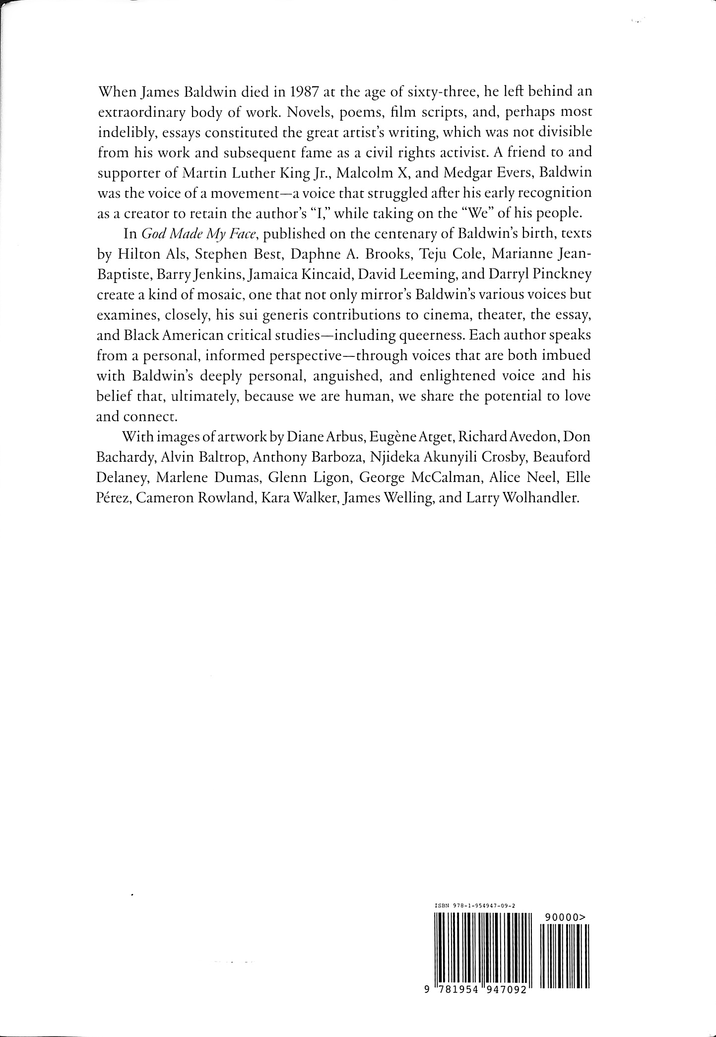 Edited by Pulitzer Prize–winning author Hilton Als and growing out of his landmark exhibition at David Zwirner in 2019, God Made My Face brings together an impressive assembly of contributors, ranging from Baldwin biographer David Leeming to novelist Jamaica Kincaid and Moonlight director Barry Jenkins, to create a memorial mosaic: one that not only mirrors Baldwin’s various tones but also closely examines his singular contributions to cinema, theater, the essay and Black American critical studies. These essays are illustrated by artwork from modern and contemporary artists who were either personal contemporaries of Baldwin or directly inspired by his work.