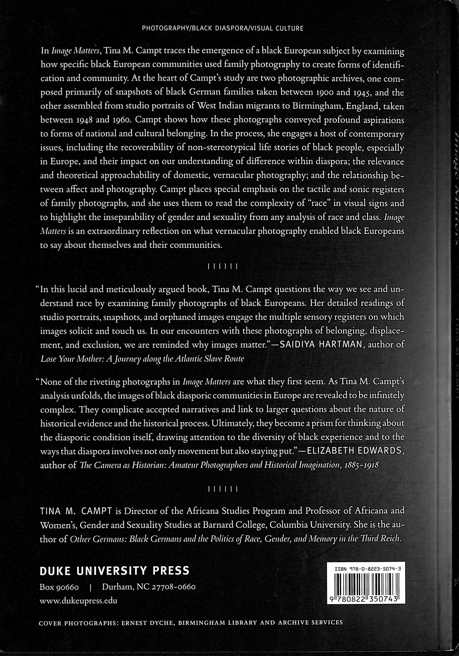 In Image Matters, Tina M. Campt traces the emergence of a black European subject by examining how specific black European communities used family photography to create forms of identification and community. At the heart of Campt's study are two photographic archives, one composed primarily of snapshots of black German families taken between 1900 and 1945, and the other assembled from studio portraits of West Indian migrants to Birmingham, England, taken between 1948 and 1960. Campt shows how these photographs conveyed profound aspirations to forms of national and cultural belonging. In the process, she engages a host of contemporary issues, including the recoverability of non-stereotypical life stories of black people, especially in Europe, and their impact on our understanding of difference within diaspora; the relevance and theoretical approachability of domestic, vernacular photography; and the relationship between affect and photography. Campt places special emphasis on the tactile and sonic registers of family photographs, and she uses them to read the complexity of "race" in visual signs and to highlight the inseparability of gender and sexuality from any analysis of race and class. Image Matters is an extraordinary reflection on what vernacular photography enabled black Europeans to say about themselves and their communities.