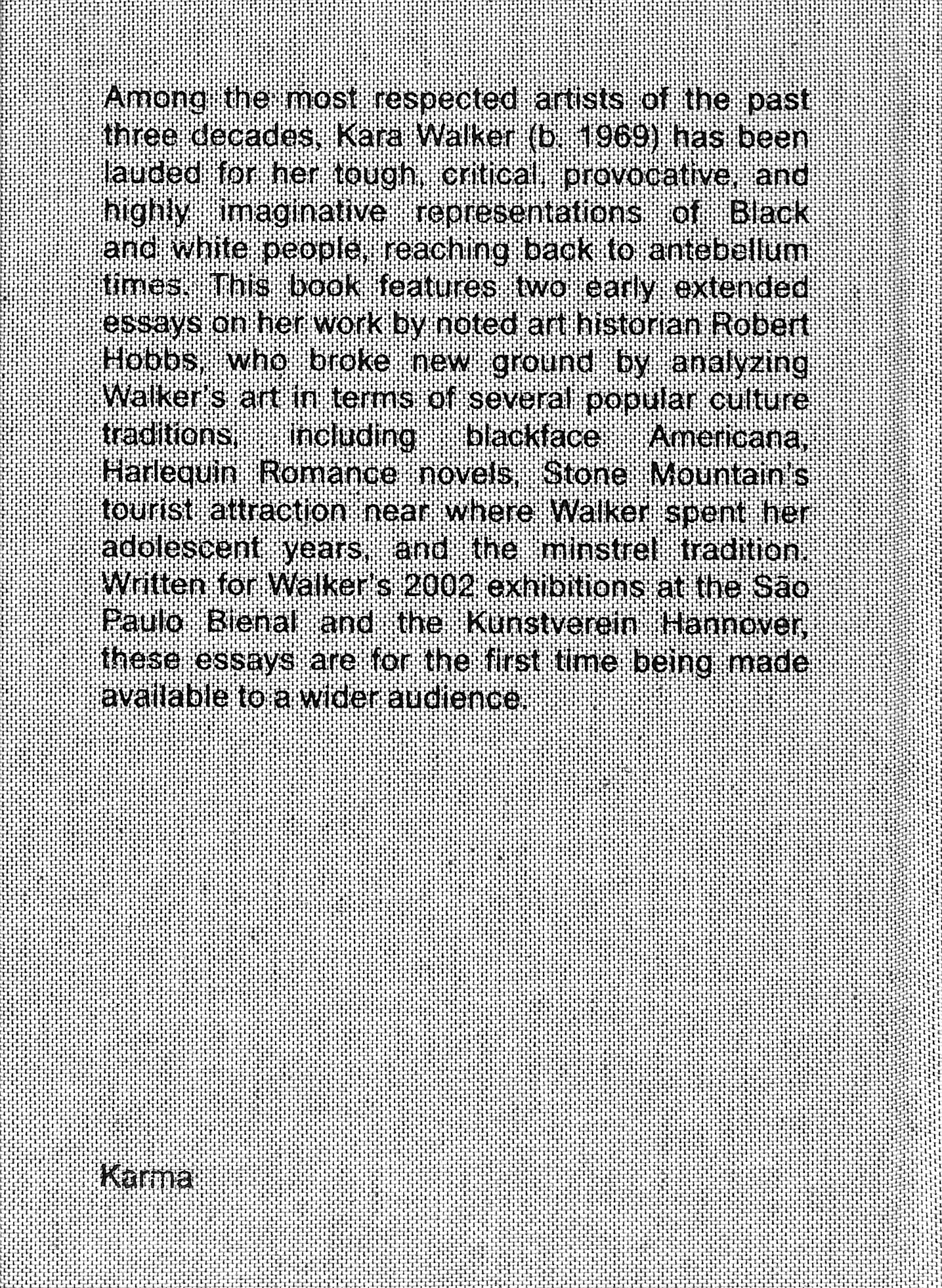 In 2002, Kara Walker was selected to represent the United States at the prestigious São Paulo Art Biennial. Curator Robert Hobbs wrote extended essays on her work for this exhibition, and also for her show later that year at the Kunstverein Hannover. Because these essays have not been distributed in the US and remain among the most in-depth and essential investigations of her work, Karma is now republishing them in this new clothbound volume.
