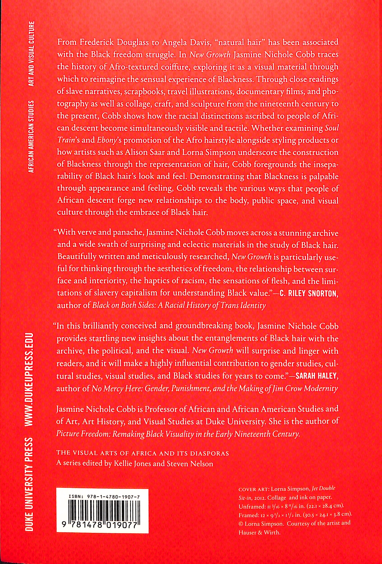 Through close readings of slave narratives, scrapbooks, travel illustrations, documentary films, and photography as well as collage, craft, and sculpture, from the nineteenth century to the present, Cobb shows how the racial distinctions ascribed to people of African descent become simultaneously visible and tactile. Whether examining Soul Train’s and Ebony’s promotion of the Afro hairstyle alongside styling products or how artists such as Alison Saar and Lorna Simpson underscore the construction of Blackness through the representation of hair, Cobb foregrounds the inseparability of Black hair’s look and feel. Demonstrating that Blackness is palpable through appearance and feeling, Cobb reveals the various ways that people of African descent forge new relationships to the body, public space, and visual culture through the embrace of Black hair.