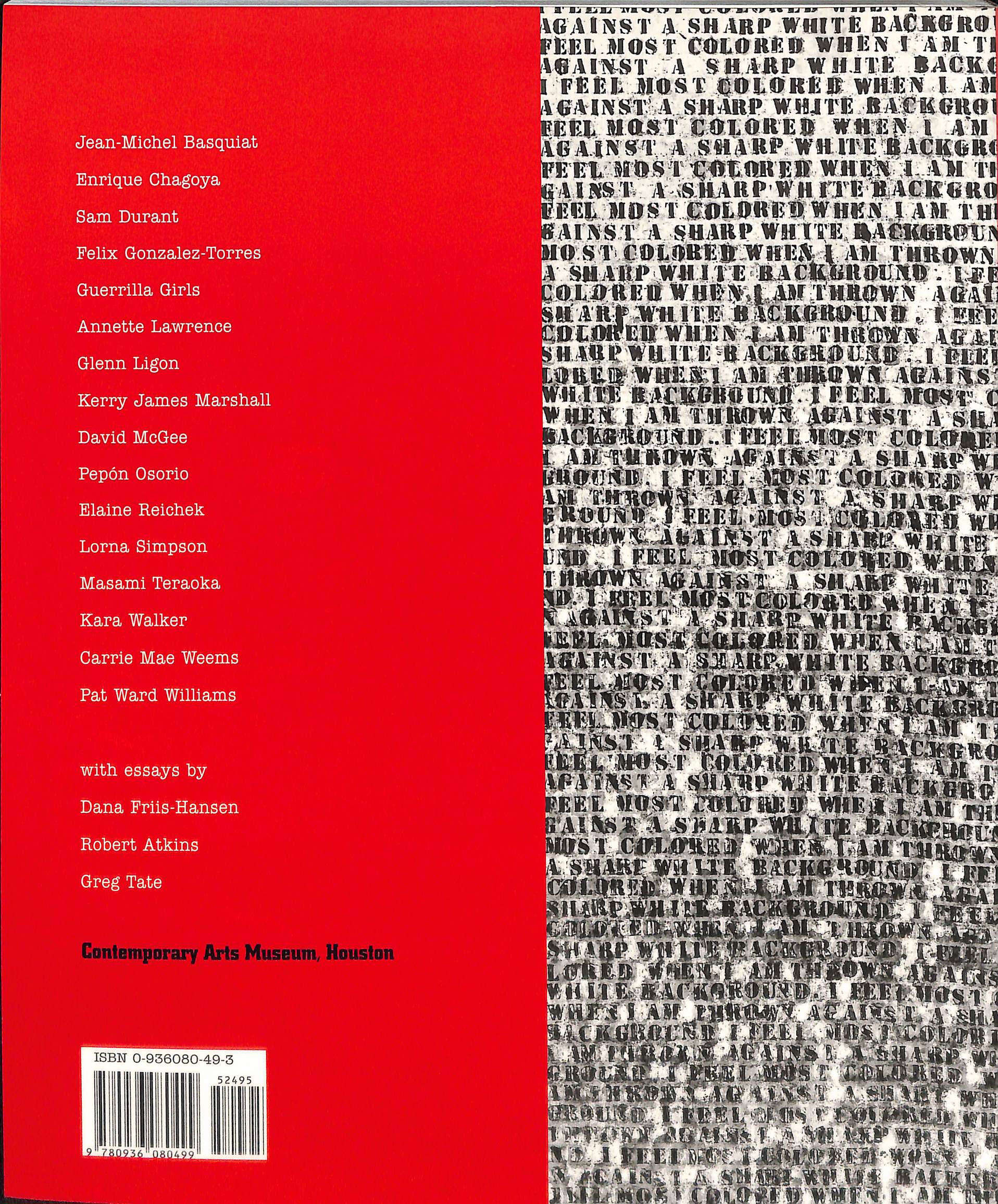 The exhibition and catalogue include a number of artists who have chosen to make art that deals with these issues—whether they are from “other” worlds of race, culture, gender, or new points of view. The exhibition and catalogue include the work of Jean-Michel Basquiat, Enrique Chagoya, Sam Durant, Felix Gonzales-Torres, The Guerrilla Girls, Annette Lawrence, Glenn Ligon, Kerry James Marshall, David McGee, Pepon Osorio, Elaine Reichek, Lorna Simpson, Masami Teraoka, Kara Walker, Carrie Mae Weems, and Pat Ward Williams. Includes essays by Robert Atkins, Dana Friis-Hansen, and Greg Tate; and documentation on the artists’ careers.