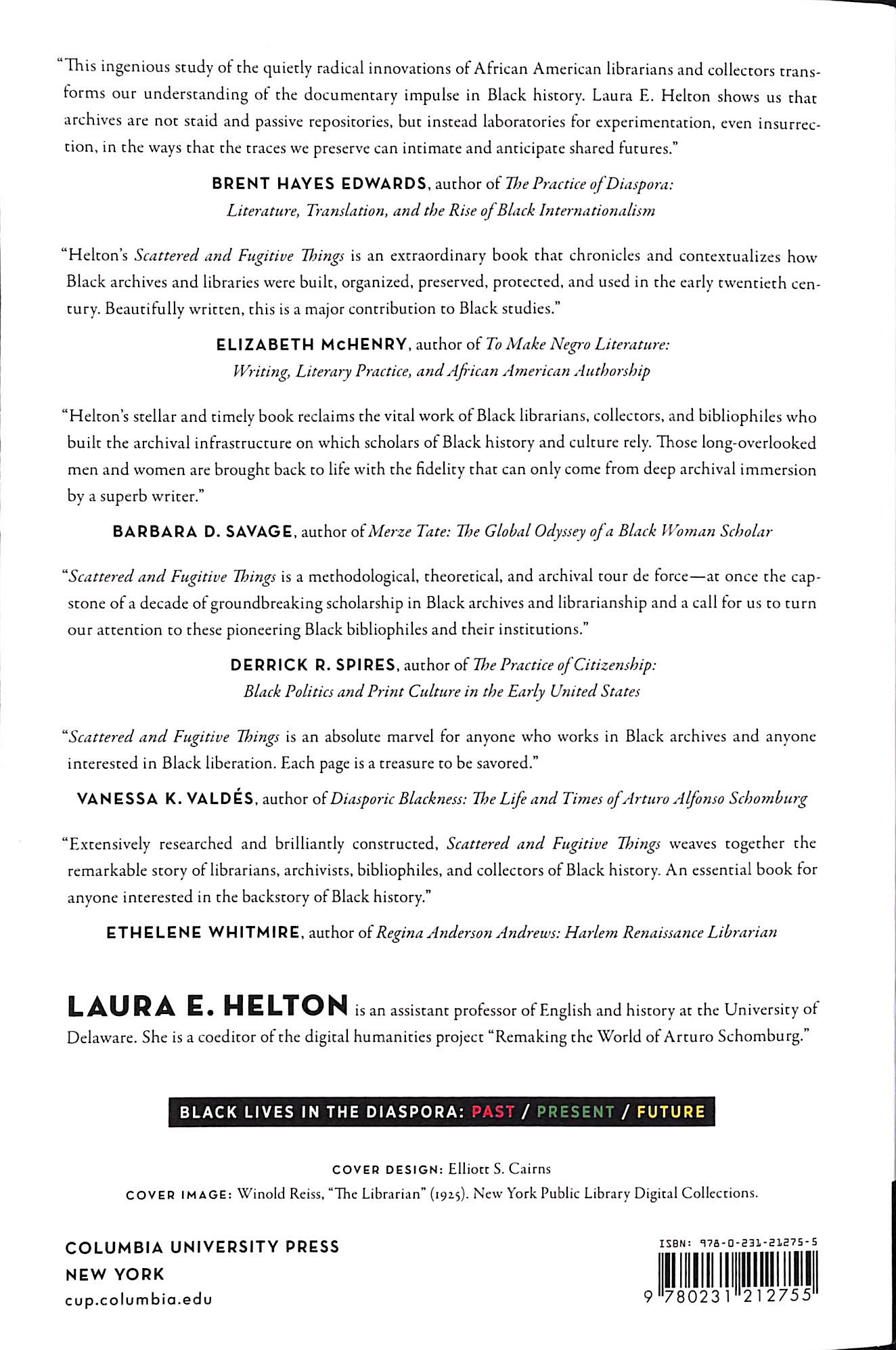 Scattered and Fugitive Things tells the stories of these Black collectors, traveling from the parlors of the urban north to HBCU reading rooms and branch libraries in the Jim Crow south. Laura E. Helton chronicles the work of six key figures: bibliophile Arturo Schomburg, scrapbook maker Alexander Gumby, librarians Virginia Lee and Vivian Harsh, curator Dorothy Porter, and historian L. D. Reddick. Drawing on overlooked sources such as book lists and card catalogs, she reveals the risks collectors took to create Black archives. This book also explores the social life of collecting, highlighting the communities that used these collections from the South Side of Chicago to Roanoke, Virginia. In each case, Helton argues, archiving was alive in the present, a site of intellectual experiment, creative abundance, and political possibility. Offering new ways to understand Black intellectual and literary history, Scattered and Fugitive Things reveals Black collecting as a radical critical tradition that reimagines past, present, and future.