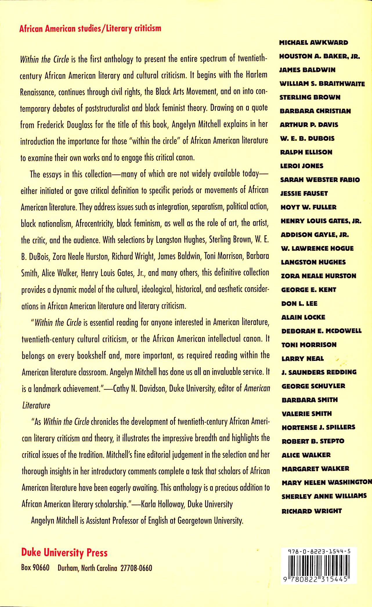 Within the Circle is the first anthology to present the entire spectrum of twentieth-century African American literary and cultural criticism. It begins with the Harlem Renaissance, continues through civil rights, the Black Arts Movement, and on into contemporary debates of poststructuralist and black feminist theory. Drawing on a quote from Frederick Douglass for the title of this book, Angelyn Mitchell explains in her introduction the importance for those "within the circle" of African American literature to examine their own works and to engage this critical canon.